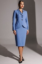 Комплект-двойка, состоящий из пиджака и юбки.  Пиджак из костюмной ткани на подкладке с расширенной линией плеч, с отрезными бочками по переду и спинке и вытачками по переду. Воротник-с отложными лацканами пиджачного типа. По переду - прорезные  карманы  с клапанами. Рукава длинные, двухшовные. Пиджак  застегивается на три пуговицы. Юбка - миди с наклонными карманами и складкой по переду, с широким поясом-обтачкой. Застегиваются на молнию спереди и пуговицу.