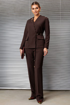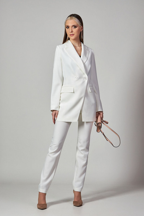 Брючный комплект из костюмной ткани на подкладке. Двубортный жакет полуприталенного силуэта с отрезными бочками и вытачками по переду и спинке. Воротник-с отложными лацканами пиджачного типа. По переду - прорезные карманы с клапанами. Рукава длинные, двухшовные. Жакет застегивается на две пуговицы. Брюки узкие, с двумя карманами и поясом-обтачкой. Застегиваются на молнию по переду и одну пуговицу.