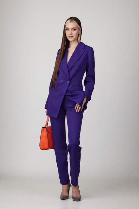 Брючный комплект из костюмной ткани на подкладке. Двубортный жакет полуприталенного силуэта с отрезными бочками и вытачками по переду и спинке. Воротник-с отложными лацканами пиджачного типа. По переду - прорезные карманы с клапанами. Рукава длинные, двухшовные. Жакет застегивается на две пуговицы. Брюки узкие, с двумя карманами и поясом-обтачкой. Застегиваются на молнию по переду и одну пуговицу.