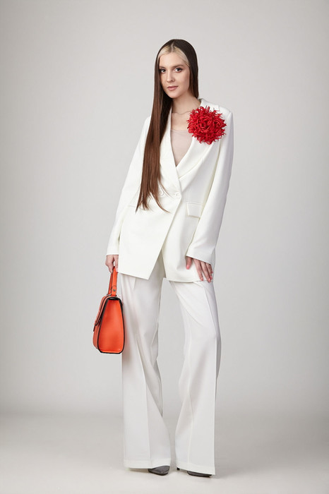 Брючный комплект из костюмной ткани на подкладке. Двубортный жакет полуприталенного силуэта с отрезными бочками и вытачками по переду и спинке. Воротник-с отложными лацканами пиджачного типа. По переду - прорезные карманы с клапанами. Рукава длинные, двухшовные. Жакет застегивается на две пуговицы. Жакет декорирован цветами-брошами ручной работы. Брюки прямые со складкой, широким поясом-обтачкой, наклонными карманами. Застегиваются на молнию по переду и пуговицу.