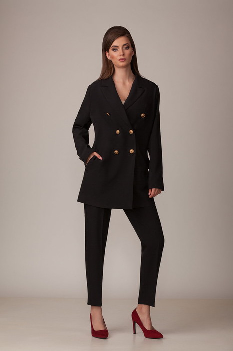 Двубортный жакет выполнен в стиле оверсайз.  Воротник-с отложными лацканами пиджачного типа, рукава – двухшовные. Карманы в боковых швах. Жакет имеет  два ряда пуговиц, застегивается на две основные пуговицы, одну потайную, остальные пуговицы несут декоративный характер.
