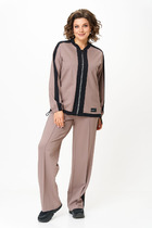 Стильная брючная пара из костюмной ткани на подкладке. Жакет слегка притален, с рельефами по переду и спинке и прорезными карманами с листочками  по переду. Воротник-английский, рукава - двухшовные. Низ переда и спинки жакета асимметричен. Шлица на спинке декорирована пуговицами. Жакет застегивается на пуговицы.  Классические брюки  слегка заужены к низу, с поясом.  Застегиваются на молнию по переду и  одну пуговицу.
