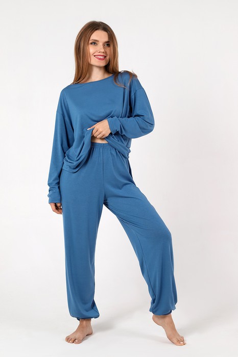 Пижама молодежная из гладкокрашеного трикотажного полотна «джерси», состоящая из лонгслива и брюк. Лонгслив - свободного покроя, с длинными втачными рукавами и горловиной овальной формы. Горловина окантована основным материалом, низ изделия с притачным поясом.Брюки – свободного покроя, с эластичной тесьмой по талии и нижним срезам.
