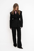 Брюки прилегающие по бедрам и расширенные к низу. В боковых швах обработаны карманы. Застежка молния, по поясу на петлю и пуговицу. По поясу шлевки.