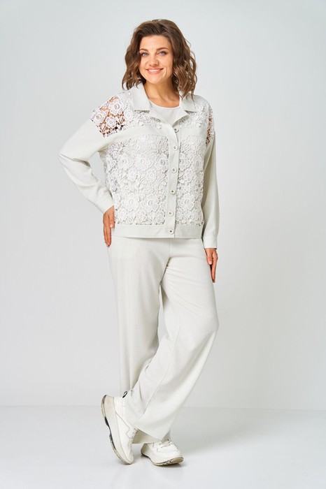 Жакет прямого силуэта выполнен из кружева. Линия плеча спущена. Застежка центральная с планкой на петли и пуговицы. По горловине отложной воротник. Перед и спинка с горизонтальными кокетками. Рукав длинный на притачной манжете с застежкой на петлю и пуговицу.