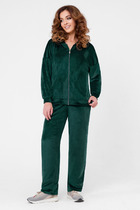 Комплект женский, 2х предметный, состоящий из футболки и брюк. Футболка прямого силуэта с коротким втачным рукавом. Вырез горловины круглой формы. По переду горизонтальный подрез. Верхняя часть задекорирована вышивкой. На спинке акцент в виде нашивки с элементом декоративной тесьмы. Брюки прямые, по низу с отворотом. По переду карманы и частичные защипы в области колена. Пояс притачной с резинкой по кругу и отделочной тесьмой спереди.