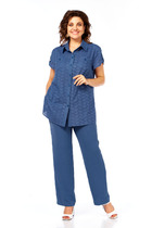 Комплект женский, 2-х предметный, состоящий из блузы и брюк.Блуза прямого силуэта с длинным рукавом. Рукав со спущенной линией плеча, по низу присобран на манжету. Манжета с застежкой на петлю и пуговицу, с возможностью регулировки по ширине. Горловина оформлена воротником, с отделочной пуговицей и мягкой складкой по центру переда. По спинке кокетка и мягкие складки. По бокам закругленные разрезы. Талия подчеркнута поясом из отделочной тесьмы. Пояс зафиксирован в боковом шве и складке переда. Брюки прямые, с наклонными карманами спереди. Пояс притачной с резинкой по кругу.