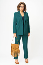 Элегантный костюм-тройка, состоящий из жакета, футболки и брюк. Жакет и брюки выполнены из костюмной ткани, футболка — из трикотажного полотна. Жакет прямого силуэта, с застежкой на две петли и две пуговицы. Перед жакета с нагрудной вытачкой, с прорезными карманами в рамку с клапаном. Спинка жакета со средним швом, заканчивающийся шлицей, левая часть спинки с прорезным карманом в рамку, вход в который фиксирует навесная петля с пуговицей. Рукава двухшовные втачные. Горловина оформлена воротником пиджачного типа. Белая футболка прямого силуэта  со спущенной линией плеча и втачным рукавом. Горловина обработана трикотажной бейкой из основной ткани. Брюки классической формы, прямого силуэта, со стрелками по передним и задним половинкам. Верхний срез обработан обтачным поясом. На задних половинках расположены талиевые вытачки, с декоративными листочками. В боковых швах брюк - наклонные карманы. Застёжка центральная на тесьму молнию и крючок.