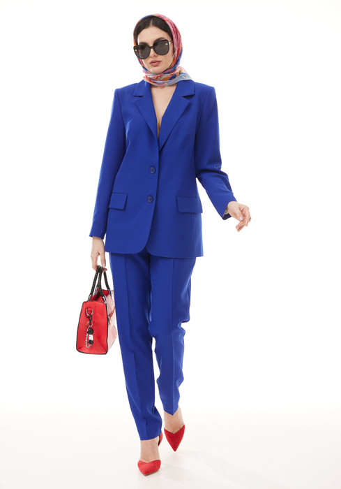 Шикарный брючный костюм в цвете индиго впишется даже в самый строгий дресс-код, а также подойдет для торжественного или вечернего образа.