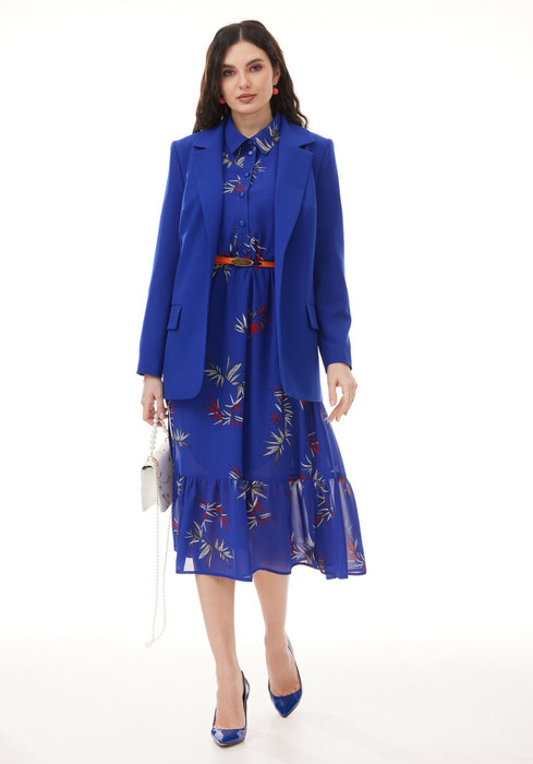 Комплект женский, состоящий из шифонового платья и классического жакета. Платье А-силуэта, на подкладке, длиной мидакси, выполненное из итальянского шифона с принтом. Платье с центральной планкой до линии талии, которая застегивается на петли и пуговицы. Горловина платья с воротником рубашечного типа. В передних рельефах, в области бедер обработаны карманы, по низу - разрезы. По нижней части платья - притачной волан. Рукав втачной, одношовный, по низу рукава - притачная манжета, застегивающаяся на петлю и пуговицу. Жакет выполнен из костюмной поливискозы на подкладке. Жакет прямого силуэта с намеком на полуприлегание, с застежкой на две петли и две пуговицы. Перед жакета с рельефами, нагрудными выточками и прорезными карманами с клапаном. Спинка жакета со средним швом. Горловина оформлена воротником пиджачного типа. В комплект входит декоративный контрастный ремень из экокожи.