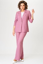 Комплект женский 3-х предметный, состоящий из блузы, брюк и жакета. Жакет полуприлегающего силуэта, на подкладке, с двухбортной застежкой  на петли и декоративные пуговицы в морской тематике. Горловина жакета V- образной формы. Рукава двухшовные длинные с возможностью подворота длины. В области груди обработан прорезной карман-обманка  с листочкой. В области бедер - прорезные карманы "в рамку". Брюки классической формы, слегка заужены к низу, со стрелками. Верхний срез обработан притачным поясом, по спинке вставлена резинка для регулировки обхвата талии. По центру переда - застёжка на крючок и тесьму-молнию. В боковых швах расположены наклонные карманы. В комплект входит контрастный узкий ремень. Блуза выполнена из шифона с принтом "полоска". Блуза без рукава, с круглой формой горловины. По низу боковых швов обработаны разрезы.