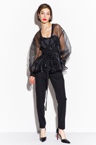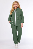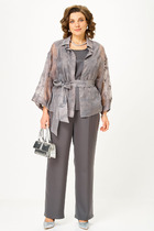 Костюм состоит из удлиненного жилета и брюк. Жилет без подкладки прямого силуэта с центральной бортовой застежкой на две петли-пуговицы, длиной ниже колена. Спинка с талиевыми вытачками, поясом и шлицей. Брюки классической формы, слегка заужены к низу, со стрелками по передним и задним половинкам. Верхний срез обработан притачным поясом, по спинке вставлена резинка для регулировки обхвата талии. По центру переда - застёжка на крючок и тесьму-молнию.