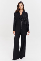 Комплект женский 2-х предметный, состоящий из блузы и брюк. Блуза выполнена из поливискозы с принтом "елочка". Блуза длиной до середины бедра, прямого силуэта, с центральной застёжкой на петли и пуговицы. Горловина рубашечного типа. Блуза со спущенной линией плеч. Рукава длинные, по низу обработана шлица и притачные манжеты, которые застёгиваются на 2 петли и пуговицы. На одной манжете настрочена декоративная нашивка. В области груди, с одной стороны, накладной карман с декоративной нашивкой. Спинка с кокеткой и со средним швом, в котором обработана шлица, застегивающаяся на 3 петли и пуговицы. Низ блузы закруглен. Брюки выполнены из полизивкозы однотонного компаньона. Брюки прямого силуэта, слегка заужены к низу. Низ брюк с цельнокроеной манжетой. Брюки с отстроченными по переду стрелками и заутюженными по задним половинкам. Верхний срез обработан притачным поясом, в который вставлена резинка. По центру переда - застёжка-обманка. В боковых швах расположены наклонные карманы.