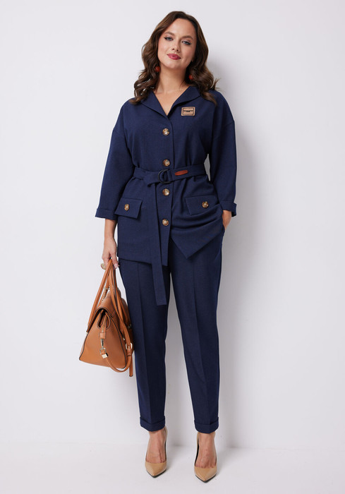 Костюм женский 2-х предметный, состоящий из жакета и брюк. Жакет выполнен из поливискозы, без подкладки. Жакет прямого силуэта, с цельнокроенным рукавом, с центральной застежкой на петли и пуговицы. Перед с нагрудными вытачками, в области груди - декоративная нашивка. По переду в области бедер обработаны прорезные карманы с листочками и клапанами, на которых пришиты декоративные пуговицы. Спинка со средним швом и талиевыми вытачками. Рукава одношовные, с цельнокроенными манжетами. В комплект входит съёмным пояс из основной ткани с Д-пряжкой и нашивкой. Брюки выполнены из полизивкозы, прямого силуэта со стрелками по передним и задним половинкам. Верхний срез обработан притачным поясом. По центру переда - застёжка на крючок и тесьму-молнию. В области боковых швов вставлена резинка. На задних половинках расположены талиевые вытачки. В боковых швах расположены наклонные карманы. Низ брюк с цельнокроенными манжетами.
