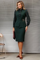 Элегантный костюм-тройка, состоящий из жакета, джемпера и брюк. Жакет и брюки выполнены из костюмной ткани, джемпер — из трикотажного полотна. Жакет прямого силуэта, с застежкой на две петли и две пуговицы. Перед жакета с нагрудной вытачкой, с прорезными карманами в рамку с клапаном. Спинка жакета со средним швом, заканчивающийся шлицей, левая часть спинки с прорезным карманом в рамку, вход в который фиксирует навесная петля с пуговицей. Рукава двухшовные втачные. Горловина оформлена воротником пиджачного типа. Джемпер прямого силуэта, выполнен из вискозы. Перед и спинка цельнокроенная. Рукав длинный. Горловина типа "водолазка". Длина изделия - середина бедра. Брюки классической формы, прямого силуэта, со стрелками по передним и задним половинкам. Верхний срез обработан обтачным поясом. На задних половинках расположены талиевые вытачки, с декоративными листочками. В боковых швах брюк - наклонные карманы. Застёжка центральная на тесьму молнию и крючок.
