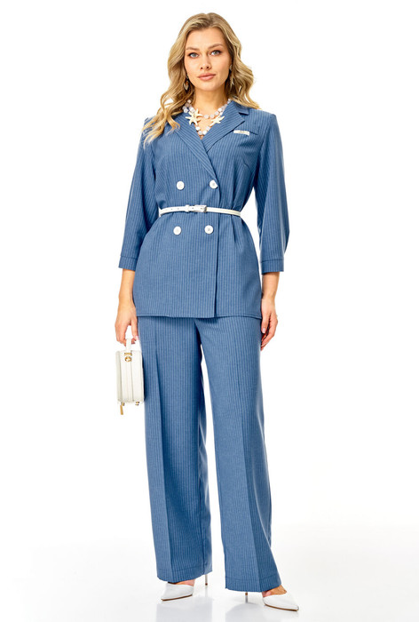 Костюм состоит из жакета и брюк. Качественная поливискоза, из которой выполнена модель, обеспечит долговечность изделию и приятные ощущения его обладательнице. Жакет без подкладки прямого силуэта, с двубортной застежкой на петли-пуговицы, длиной до середины бедра. Перед жакета с нагрудными вытачками, в области груди расположена декоративная листочка. Спинка с двойной кокеткой, в шве притачивания которой обработана встречная складка. Низ жакета фигурный, с закруглениями по боковым швам. Рукава двушовные, длиной 3/4, по низу с манжетой, застегивающейся на петлю и пуговицу. Горловина оформлена воротником пиджачного типа. Брюки классической формы, прямые от линии бедер, со стрелками по передним и задним половинкам. Верхний срез обработан поясом, в который от бокового шва вставлена резинка по задним половинкам. В боковых швах обработаны наклонные карманы. На задних половинках расположены талиевые вытачки. В комплект входит ремень.