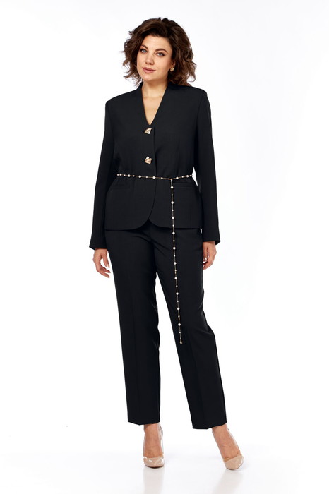 Костюм женский двухпредметный, состоящий из жакета и брюк. Жакет полуприлегающего силуэта на подкладке с центральной бортовой застежкой на 2 декоративные петли-пуговицы. Перед с талиевой вытачкой, отрезным бочком и карманом с листочкой. Борт имеет закругленную форму. Горловина оформлена фигурно с цельнокроенной стойкой по переду и с отрезной по спинке. Спинка со средним швом. Рукава втачные двухшовные с отлетной шлицей, открытой с настрочной декоративной тесьмой, двумя блочками и одной петлей-пуговицей. Брюки классического кроя, слегка зауженные к низу, с притачным поясом сзади на резинке. Застежка на тесьму-молнию и одну петлю-пуговицу по поясу. Карман фигурной формы, с отрезным бочком. На изделии заутюжены стрелки.