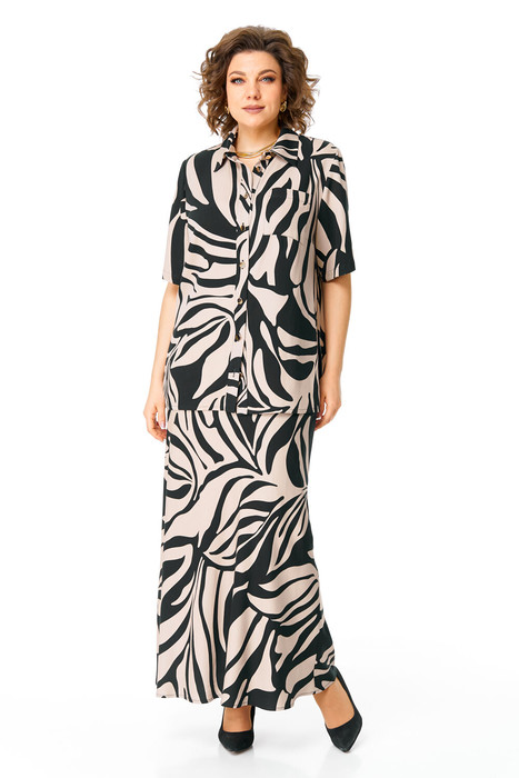 Блуза свободного покроя с естественной линией плеча. Перед с отрезной планкой, нагрудной вытачкой и накладным карманом с левой стороны. Рукав втачной одношовный до линии локтя. Воротник блузочный на отрезной стойке. Застежка на петли-пуговицы.