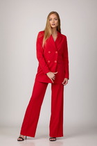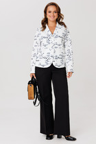 Комплект состоит из топа и брюк. Топ прямого силуэта с естественной линией плеча. По переду выполнены нагрудные вытачки.Горловина округлой формы. В горловине спинки выполнен вырез "капля" с застёжкой на навесную петлю и пуговицу.Верхний слой топа выполнен из полотна с "ресничками". Нижний слой топа - из трикотажной подкладки.Рукав длиной до линии локтя. Брюки расширенные к низу типа "палаццо" с центральной застёжкой на молнию и петлю-пуговицу. В боковых швах карманы с отрезным бочком.Пояс притачной с резинкой по задней части пояса. В комплект входит съёмный цветок с перьями контрастного цвета.