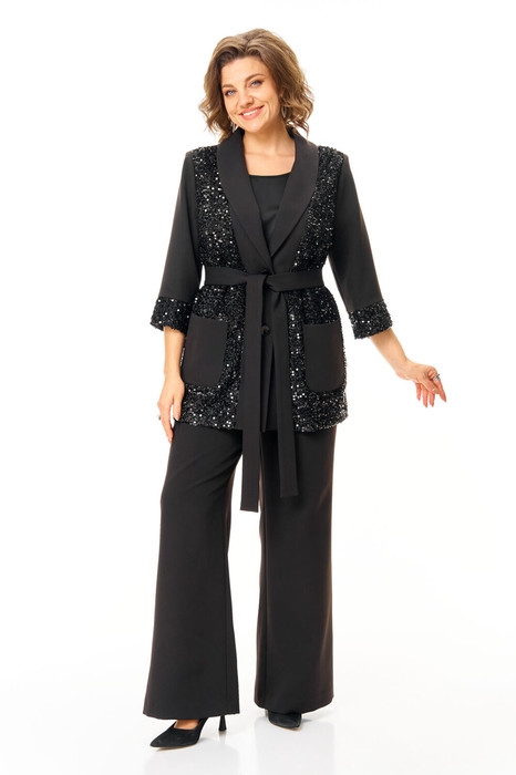 Жакет свободного покроя с естественной линией плеча. Рукав втачной одношовный длиной 3/4 с манжетой из отделочной ткани "пайетки". Перед выполнен из отделочной ткани "пайетки" на атласной подкладке. Обработаны отрезные планки. Застежка центрально-бортовая на петли пуговицы. Воротник отложной типа "шаль". На переде выполнены накладные карманы.
