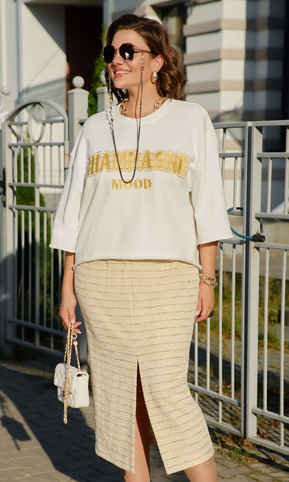 Если ищите идеальный образ на весну, Вам подойдёт данный комплект выполненный в стиле «спорт-шик». Он состоящит из однотонного свитшота с дизайнерской вышивкой и юбки длинны «миди» из трикотажного полотна в стиле «шанель». Этот комплект идеально подходит для создания стильного образа, сочетая в себе комфорт и элегантность.