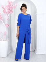 Комплект женский, состоящий из блузона и брюк. Блузон (состав: 60% полиэстер, 40% полиуретан) свободного силуэта, с вырезом горловины по форме «лодочка». По переду и спинке блузона вертикальный подрез смещённый влево от центра со вставкой из отделочного материала. Рукава в блузоне разных видов- левый цельнокроеный, длиной 7/8; по правой стороне линия плеча спущенная, рукав втачной, из отделочной ткани, длиной 7/8. Низ ассиметричный, в боковых швах от низа небольшие разрезы. Брюки (состав: 60% полиэстер, 40% полиуретан).  прямого силуэта из кожи с рельефами и отстрочкой по переду. По переду застежка на тесьму молнию в гульфике и пуговицу в поясе. По переду брюк наклонные карманы. Пояс притачной со вставкой эластичной тесьмы резинки в «бочках», что обеспечивает комфортную посадку на фигуру.  Мягкая, но плотная кожа облегает фигуру, не стягивая её, а лишь подчёркивая женственные изгибы, добавляют образу элегантной строгости. В качестве дополнительного декоративного элемента в комплекте идёт декоративное украшение. Обращаем Ваше внимание, что фурнитура может незначительно отличаться от фото. Длина блузы 65 см (р 52-56), 67 см (р 58-62). Длина рукава 56 см.  Длина брюк по боковому шву 98 см.
