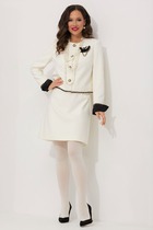 Комплект женский, состоящий из блузки и брюк. Блуза (состав: 61%район, 39%вискоза) выполнена из ткани с тонким шёлковым блеском - мерцает при движении. Блуза свободного силуэта с вырезом горловины в виде «лодочки». Спинка без особенностей. Низ ассиметричный с разрезами в боковых швах от низа. Рукав в блузе втачной на подкладке, в виде буфа, с залаженными декоративными складками по окату и низу. В комплекте идёт пояс из основной ткани. Брюки (состав: 60% полиэстер, 40% полиуретан) прямого силуэта из кожи с рельефами и отстрочкой по переду. По переду застежка на тесьму молнию в гульфике и пуговицу в поясе. По переду брюк наклонные карманы. Пояс притачной со вставкой эластичной тесьмы резинки в «бочках», что обеспечивает комфортную посадку на фигуру. Длина блузы 76,5 см (р 50-54), 77 см (р 56-60), длина рукава 37/45 см. Длина брюк по боковому шву от пояса 98 см.