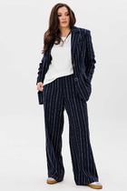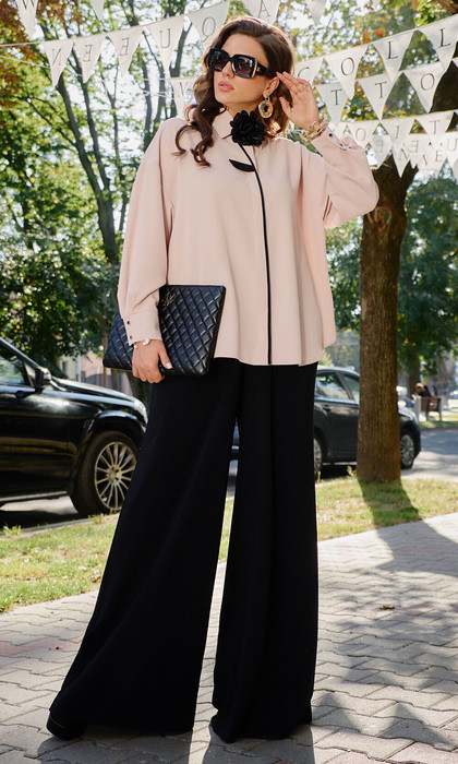Блузка свободного силуэта с центральной потайной застёжкой на петли пуговице по планке, воротником рубашечного типа. В качестве дополнительного декоративного элемента по планке идет кант из отделочной ткани и декоративная брошь «цветок». Спинка в блузке со средним швом. Рукав втачной, длинный с заложенными складками по низу. По низу рукава манжета с застёжкой на петли пуговицы. Низ в блузке закруглённый, ассиметричный. Брюки свободного силуэта, широкие с притачным поясом на резинке для максимально удобной посадки на любой тип фигуры. Застежка на тесьму молнию в гульфике и пуговицу по центру переда. По переду брюк прорезные карманы. Пояс в брюках притачной.Длина блузки от высшей точки плечевого шва до низа 76,5 см(р.52-56), 77,5 см (р.58-62). Длина рукава от головины с плечом и манжетом 74 см(р.52-56), 75 см (р.58-62). Длина брюк по боковому шву от шва притачивания пояса 108 см.