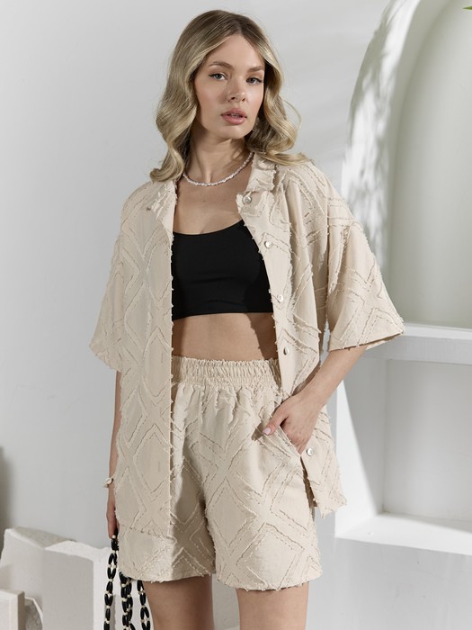 Костюм женский из фактурного полотна, свободный, состоящий из блузки и шорт. Блузка со спущенной линией плеч, с отложным воротником, застежкой на пуговицы, фигурной линией низа, рукавами средней длины, закрывающими локти. В боковых швах сорочки расположены шлевки со съемным поясом. Шорты с боковыми карманами, на притачном поясе с отстроченной эластичной тесьмой.