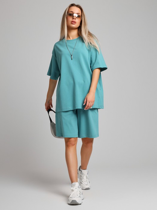 Костюм женский из плотного гладкокрашеного трикотажного полотна "кулирка", состоящий из футболки и шорт. Футболка - свободного покроя, с удлиненными плечевым и швами, короткими втачными рукавами и горловиной овальной формы, обработанной втачной планкой. В нижней части переда слева настрочен декоративный элемент прямоугольной формы. По горловине проложена отделочная строчка. Шорты - классического покроя, на притачном поясе с эластичной тесьмой внутри и карманами в боковых швах. Для регулирования степени прилегания шорт по талии в пояс вставлен шнурок, продетый через два отверстия в соединительных швах в центре пояса.