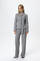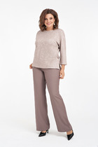 Костюм женский из трикотажного полотна "кулирка" в комбинации двух видов: гладкокрашенного и с рисунком в крупную клетку, сочетающихся между собой по цвету, состоящий из джемпера и брюк. Джемпер - из гладкокрашеного полотна, свободного покроя, с длинными втачными рукавами и приспущенными плечами, с горловиной овальной формы и тематическим принтом, выполненным в технике шелкографии. Горловина, нижние срезы рукавов и низ изделия обработаны подгибкой с отделочным широким кантом контрастного цвета. Брюки - из полотна в клетку, свободного покроя, прямые, на притачном поясе с эластичной тесьмой внутри, с карманами в боковых швах. Нижние срезы обработаны подгибкой.