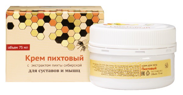 Пихтовый крем для суставов и мышц содержит экстракт сибирской пихты – сырья для изготовления камфары, которую применяют от ревматизма. Полный рецепт препарата содержит около 15 натуральных компонентов, среди которых – такие известные средства как барсучий жир, прополис, воск и яд пчелиный, а также противовоспалительный травяной сбор. Крем эффективен как профилактика заболеваний сустава, способ расслабления мышц и снятия отеков.