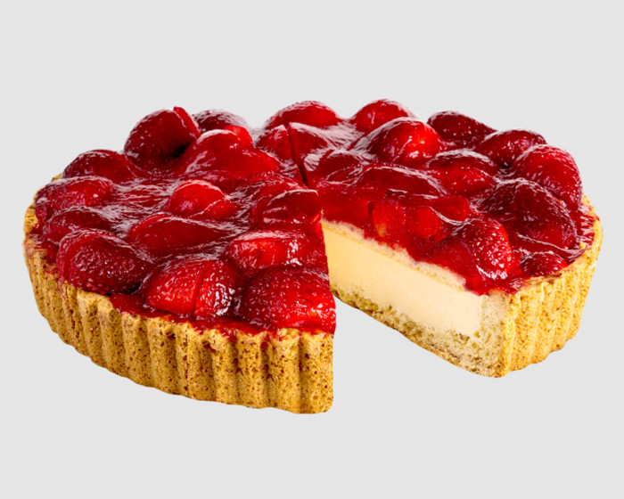 Классический чизкейк на основе песочного коржа и сырной начинки, усыпанный ягодами сочной клубники.