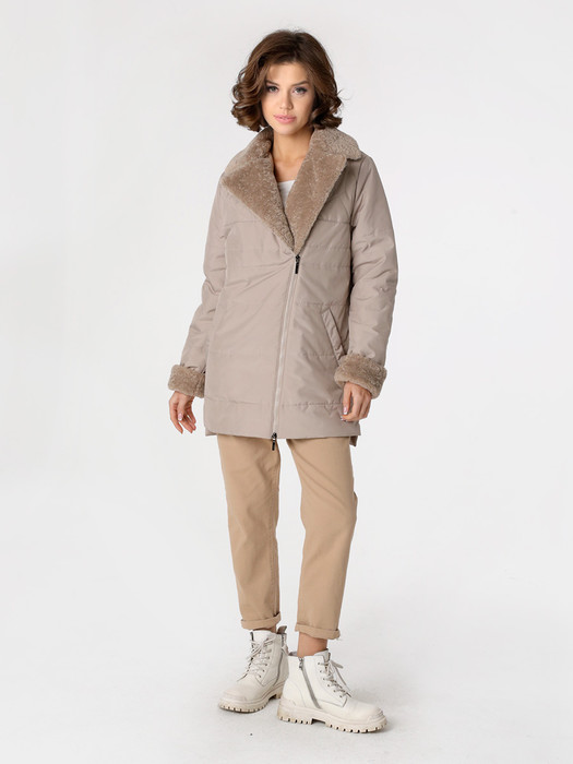 Демисезонная куртка прямого силуэта (легкий оверсайз) с ассиметричной застежкой на двухзамковую молнию подойдет для женщин и девушек любого возраста. Воротник, лацканы и отворот втачного рукава выполнены из мягкого искусственного меха. Эта стильная удлиненная куртка-косуха выручит Вас осенью и ранней зимой. Плащевая ткань имеет водоотталкивающую пропитку, которая выдержит небольшой дождь, снег и ветер. Хорошо зарекомендовавший себя утеплитель Холлофайбер плотностью 150 гр/м защитит от холода и ветра. Подкладка в изделии - в мелкую полоску.