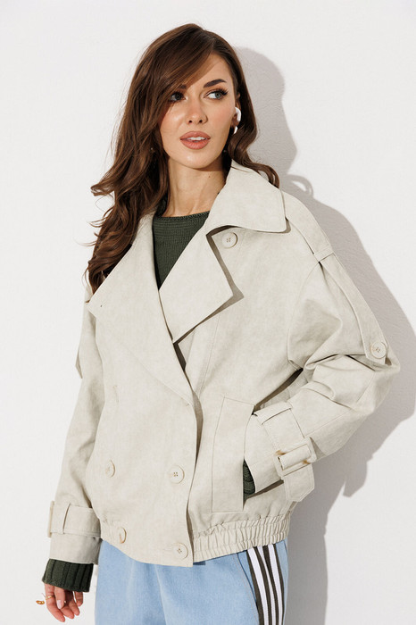 Куртка-тренчкот прямого силуэта с двубортной застежкой на петли-пуговицы, двухшовным рукавом и спущенной линией плеча, по низу рукавов паты с пряжкой. По полочке рукав втачной по спинке-реглан. Воротник пиджачного типа - отложной с лацканом. Полочка с карманом-листочкой. Спинка со средним швом и рельефом. По плечевому шву погон с застежкой на петли-пуговицы с щлеками. По низу притачная отстроченная планка со вставленной в нее резинкой. Куртка на подкладке.