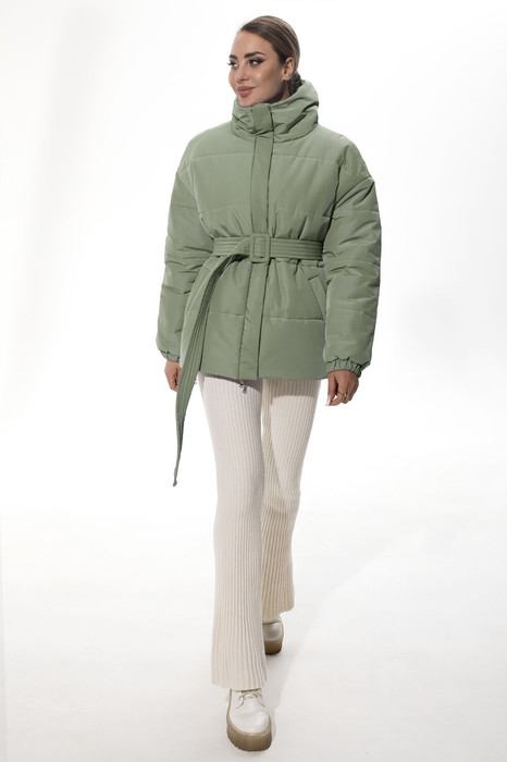 Куртка утепленная, с центральной застежкой на молнию, с высоким воротником- стойкой, планкой, застегивающейся на кнопки. На полочках расположены прорезные карманы с листочками. Рукав втачной, с отрезной манжетой. Манжета присборена на резинку. Плечо спущенное. Куртка со съемным поясом.