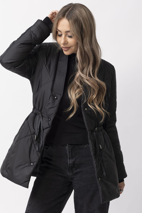 Куртка утепленная, с центральной застежкой на кнопки, втачным воротником, V-образным вырезом горловины. На полочках расположены прорезные карманы с листочками. На линии талии расположена кулиса со шнуром. Толщина синтепона 150г/м2, , изделие рекомендуется до -5 градусов.
