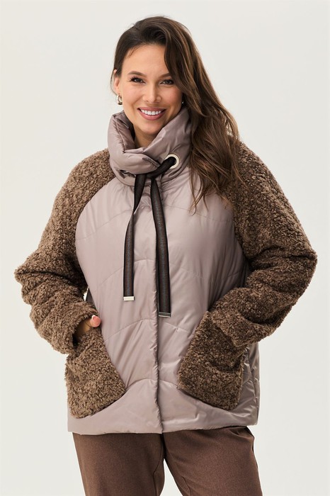 Стильная теплая и очень уютная куртка свободного кроя с центральной застежкай на молнию и металлические кнопки.  Горловина обработана высокой стойкой, дополненной металлическими люверсами и тесьмой. Куртка выполнена из плащевой ткани, утепленной HOOPON (120) .Рукава и карманы выполнены из эко меха премиум класса.  Длина куртки от плечевого шва 73см.  Длина рукава 61 см