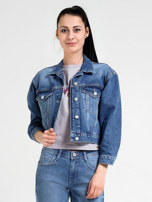Классическая универсальная укороченная женская джинсовая куртка. Прямой силуэт, пройма и рукава обеспечивают комфорт и не сковывают движения, по низу рукавов манжеты, застегивающиеся на пуговицу; стандартный воротник; на груди карманы с клапаном, также застегивающимся на пуговицу; на поясе по бокам куртки хлястик и две пуговицы, которые позволяют регулировать длину обхвата по поясу. Выполнена из качественной ткани denim 100% хлопок. Средняя стирка с потертостями спереди, сзади и рукавах.