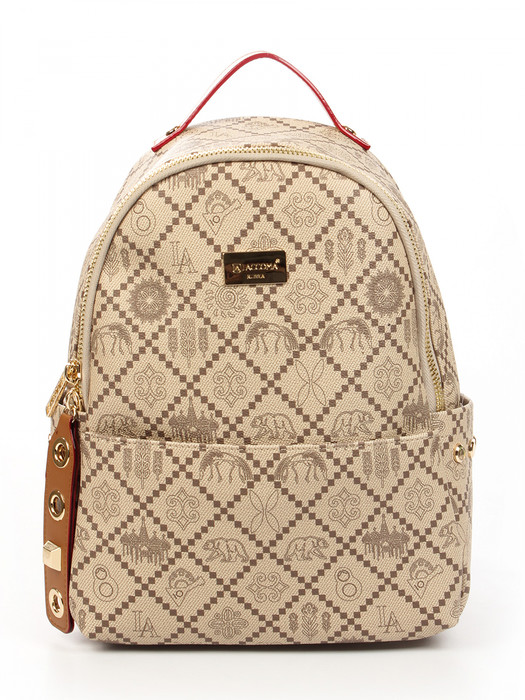 Рюкзак выполнена из экокожи канва. Детали: 1 короткая ручка 15см., 2 регулируемые лямки на плечо укрепленные стропой от 50см до 95см. Внутри изделия: 1 отделение на молнии, 1 карман на молнии, 1 евро карман на молнии, 1 карман открытый. Снаружи изделия: 1 карман на молнии спереди изделия, 1 карман на молнии сзади изделия и 2 кармана по бокам изделия. Брендированная подкладка из хлопка. Металлическая брендированная фурнитура золотистого цвета. В комплекте фирменный пыльник.