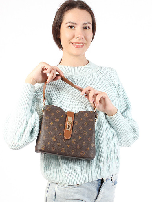 Сумка женская выполнена из экокожи канва. Детали: 1 съемная короткая ручка 40см., 1 регулируемая съемная ручка 110-125см. Внутри изделия: под хлястиком на поворотном замке 1 отделение на молнии и 2 отделения на магнитной кнопке, 1 карман на молнии, 1 карман открытый. Брендированная подкладка из хлопка. Металлическая брендированная фурнитура золотистого цвета. В комплекте фирменный пыльник.
