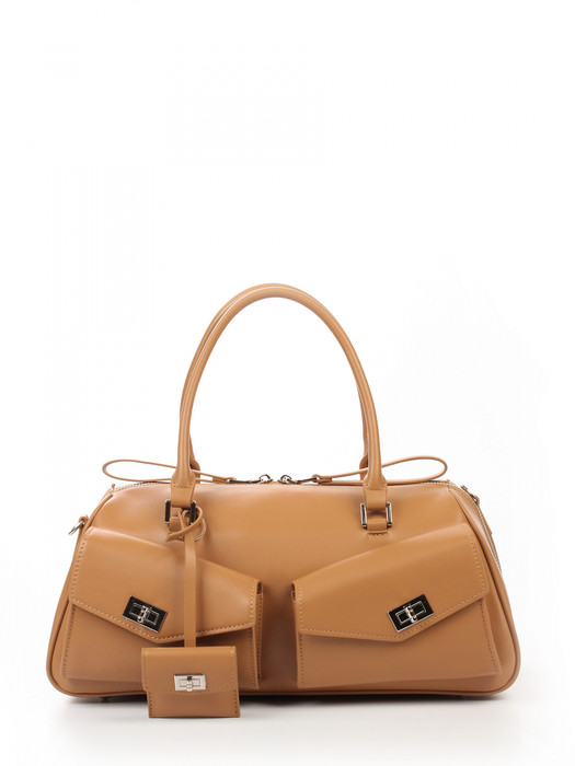 Сумка женская выполнена из натуральной кожи. Детали: 2 ручки 45 см, 1 регулируемая ручка на карабинах от 110 см до 135 см. Сумка на ножках. Каркас сумки: жесткий. Фактура кожи: гладкая. Застежка: молния. Внутри изделия: 1 отделение, 1 карман на молнии, 1 открытый карман. Снаружи изделия: 1 карман на молнии сзади, 2 кармана на клапанах спереди. Подкладка из хлопка. Металлическая брендированная фурнитура серебристого цвета. В комплекте фирменный пыльник для хранения сумки.