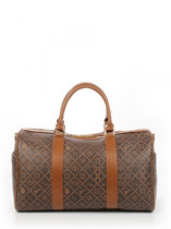 Сумка дорожная выполнена из экокожи «канва». Детали: 2 ручки по 60 см., 1 длинный регулируемый ремень на карабинах. Внутри изделия: 1 отделение на молнии, 1 карман на молнии, 2 открытых кармана. Снаружи изделия: 2 кармана на молнии спереди изделия, 1 карман на молнии сзади изделия. Брендированная подкладка из хлопка. Металлическая брендированная фурнитура золотистого цвета.