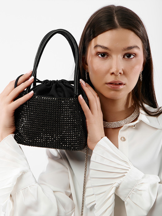 Сумка женская выполнена из текстиля, декорирована стразами, с элементами эко кожи. Детали: 2 короткие ручки по 37 см, 1 длинный ремешок на плечо из цепочки 120см. Внутри изделия: 1 отделение. Брендированная подкладка из хлопка. Металлическая фурнитура серебристого цвета. В комплекте фирменный пыльник.