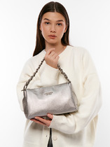 Сумка женская выполнена из текстиля, декорирована стразами, с элементами эко кожи. Детали: 1 короткая ручка 25см, 1 длинный ремешок на плечо из цепочки 120см. Внутри изделия: 1 отделение, застежка на фастекс – замок, 1 открытый карман. Брендированная подкладка из хлопка. Металлическая брендированная фурнитура серебристого цвета. В комплекте фирменный пыльник.