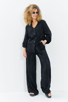 Элегантный женский комплект - двойка: блузон, брюки.Блузон прямого силуэта с разрезами по боковым швам.Застёжка - отрезная планка с петлями и пуговицами. Воротник рубашечный на отрезной стойке.По переду вставка из отделочного материала. По спинке кокетка и талевые вытачки.Брюки классические, зауженные к низу, с нормальной высотой сидения, комфортной посадки, на обтачке.Длина блузона по спинке 84 см. Длина рукава - 25 см. Длина брюк по боковому шву 102 см.