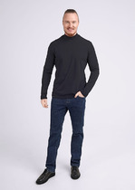 Лонгслив-поло из однотонного хлопкового полотна с добавлением лайкры. Втачной рукав на манжете, воротник на отрезной стойке с застежкой на три пуговицы.