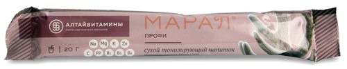 Комплексный профессиональный напиток с расширенным составом, включающим в себя дополнительные растительные компоненты – естественные адаптогены. МАРАЛ® ПРОФИ может применяться в качестве специализированного спортивного напитка при плотном тренировочном графике, экстремальных нагрузках на соревнованиях самого высокого уровня. Не содержит компонентов, обладающих допинговой активностью. Состав: сахар-песок, изомальтулоза, мальтодекстрин, сок концентрированный неосветлённый черноплодно-рябиновый, глюкоза, кислота лимонная (регулятор кислотности), экстракт левзеи, цитрат натрия трёхзамещённый безводный, натрия хлорид, цитрат калия, аскорбиновая кислота (витамин С), дицитрат магния трёхзамещённый безводный, лактат цинка, ароматизатор натуральный «Чёрная смородина», никотинамид (витамин PP), пантогематоген сухой, экстракт красного корня сухой, экстракт красной щётки сухой, пантотенат кальция (витамин В5), пиридоксина гидрохлорид (витамин В6), тиамина гидрохлорид (витамин В1). Показания к применению: рекомендуется в качестве биологически активной добавки к пище – тонизирующего средства и дополнительного источника витаминов С, PP, B1, B6 и пантотеновой кислоты (витамина B5). Противопоказания: индивидуальная непереносимость компонентов, беременность, кормление грудью, выраженный атеросклероз, сердечная недостаточность, повышенная нервная возбудимость, бессонница, гипертония, ожирение, нарушения углеводного обмена, возраст до 18 лет. Перед применением рекомендуется проконсультироваться с врачом. Способ применения и дозы: взрослым – по 20 г (1 полная столовая ложка) порошка, растворив в 200-250 мл питьевой воды, 2 раза в день во время еды. Продолжительность приёма – 1 месяц. При необходимости приём можно повторить. Условия хранения: хранить в сухом, защищённом от попадания прямых солнечных лучей месте при температуре не выше 25 °С. Срок годности: 12 месяцев с даты изготовления.