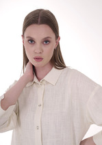 Ключевая деталь — горловина с мягкой драпировкой, которая добавляет образу легкости и движения. Удобный короткий рукав и аккуратная обработка всех краев обеспечивают комфорт и поддерживают аккуратную форму. Специальные текстильные петли внутри помогают сохранять красивую линию складок.