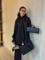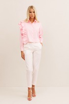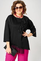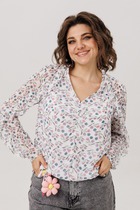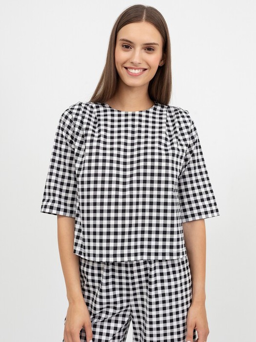 Укороченная женская блузка А-образного силуэта из хлопкового поплина – плотного текстильного полотна, которое отлично держит форму. Сзади блузка застегивается на пуговицы. Рукава широкие и прямые, длиной до локтя. Линия плеча удлиненная, с необычной складочкой. Идеально решение для ваших стильных образов!